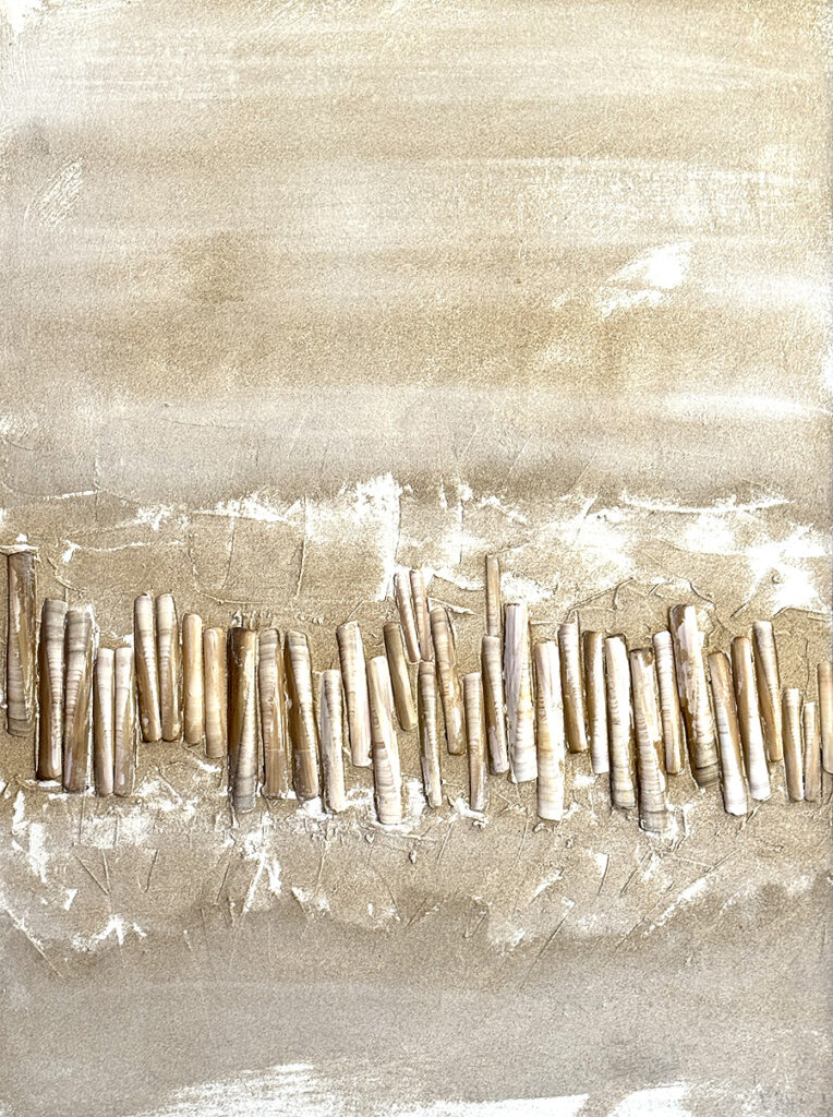 Materialcollage 60 x 80 cm, Keilrahmen, Leinwand, Acryl, Meersand Muscheln. Preis 650€